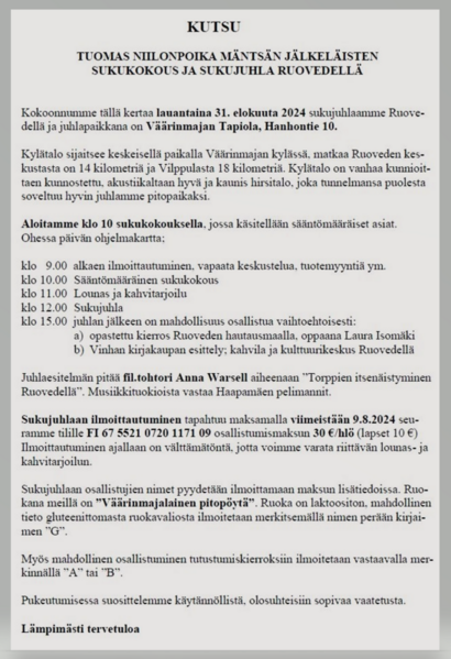 PS. Vanha FB-sivusto ei enää edusta Tuomas Niilonpoika Mäntsän sukuseuraa. Jos sivusto vielä herää henkiin, se toimii yksityisellä pohjalla.