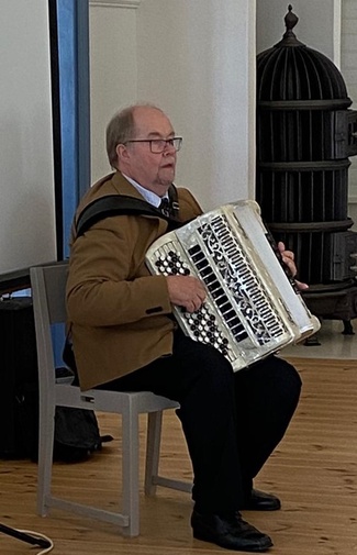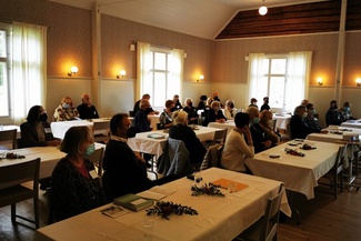 ![]() Sukuseuran seudulla asuva jäsen Jouko Laine ohjeisti vierailua Haukilan kartanoon. Jouko ja Riitta Laine olivat myös huolehtineet juhlasalin pöytien koristelusta pihlajanmarjatertuilla. |