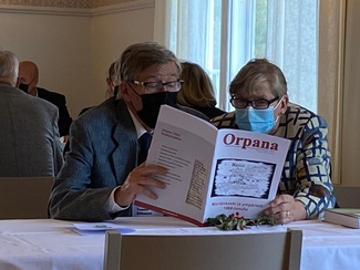 Pitkäaikainen sukuseuran toiminnantarkastaja Tuomo Riihonen ja Anri Riihonen tutkimassa Orpana-lehden Mäntän teemanumeroa, jossa on useita Aarno Raittilan kirjoittamia artikkeleita. |